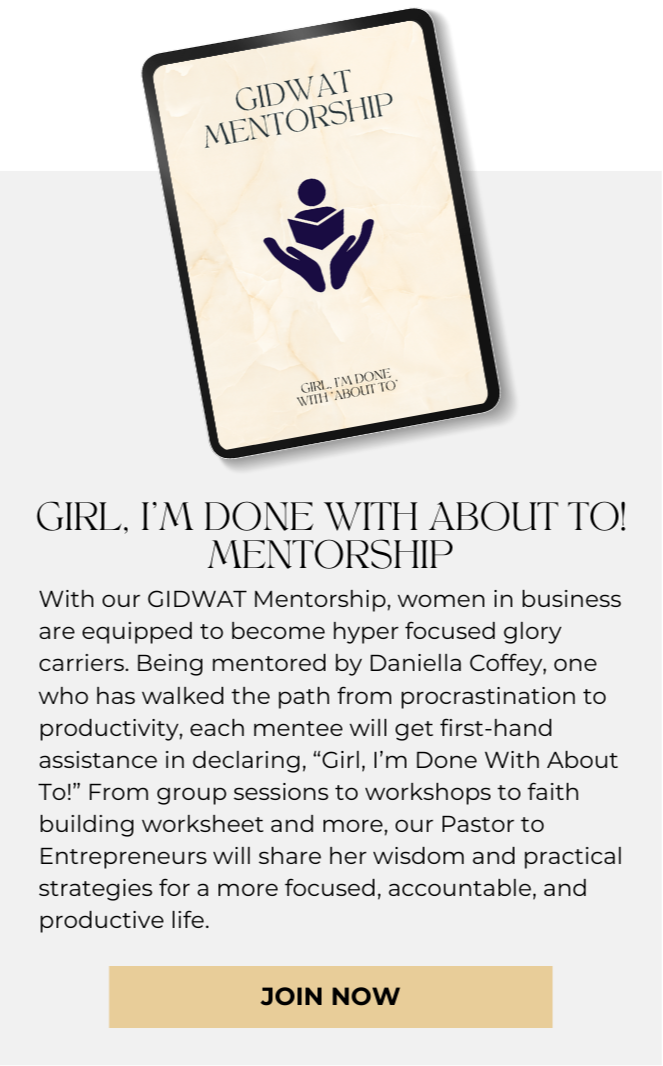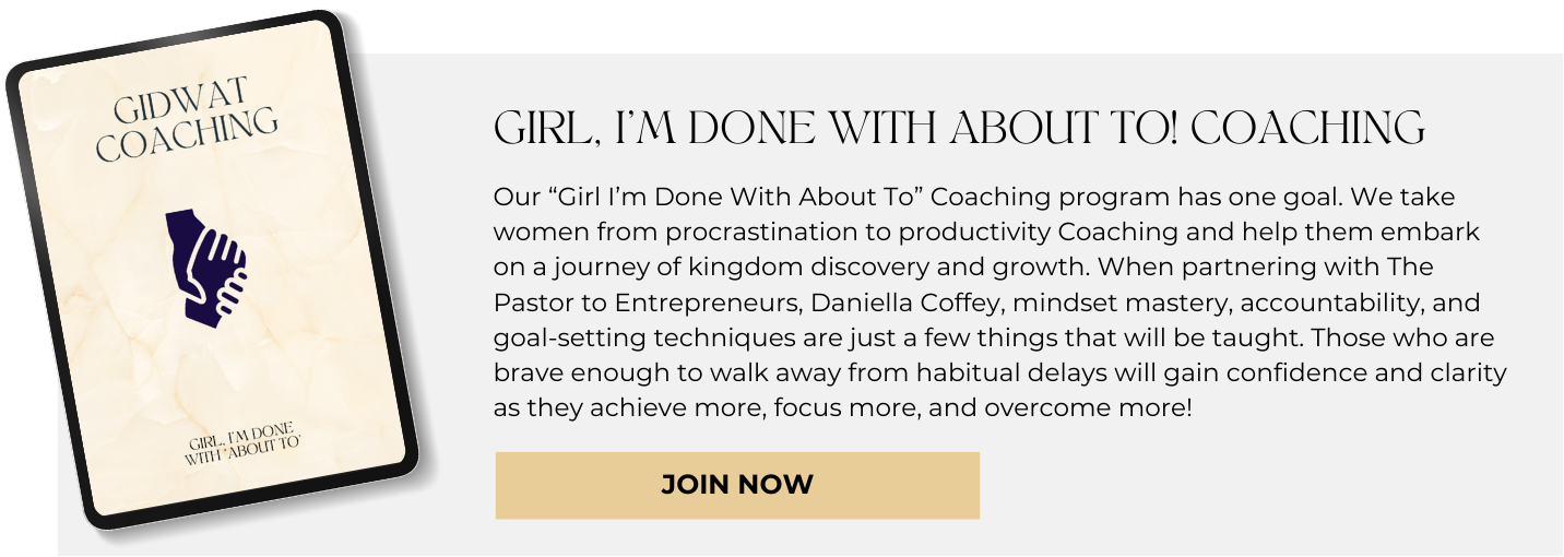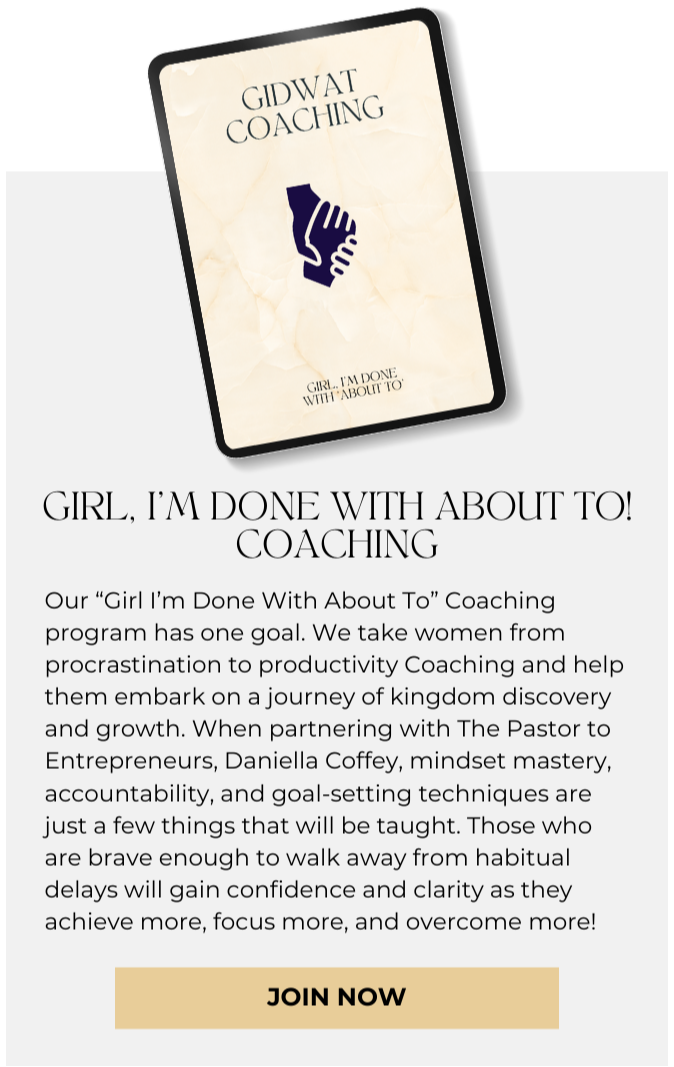 Our “Girl I’m Done With About To” Coaching program has one goal. We take women from procrastination to productivity Coaching and help them embark on a journey of kingdom discovery and growth. When partnering with The Pastor to Entrepreneurs, Daneilla Coffey, mindset mastery, accountability, and goal-setting techniques are just a few things that will be taught. Those who are brave enough to walk away from habitual delays will gain confidence and clarity as they achieve more, focus more, and overcome more!