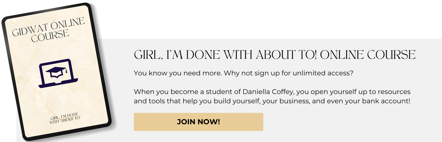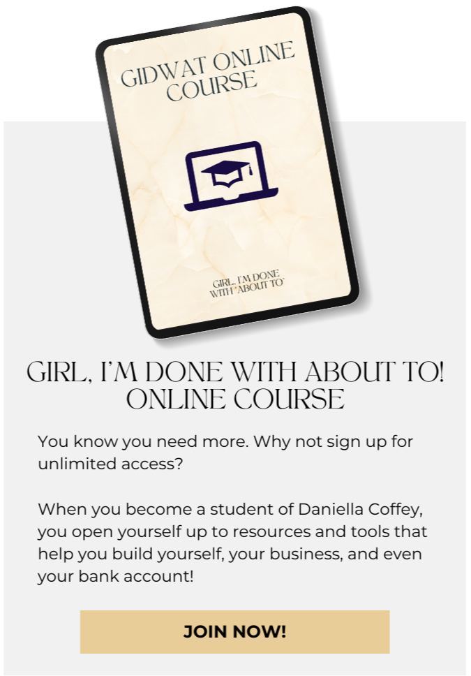 Book a 1-hour hyper focused "Girl I'm Done With About To"Â coaching call and discover how Daniella Coffey, The Pastor To Entrepreneurs can help you get DONE with ABOUT TO!
