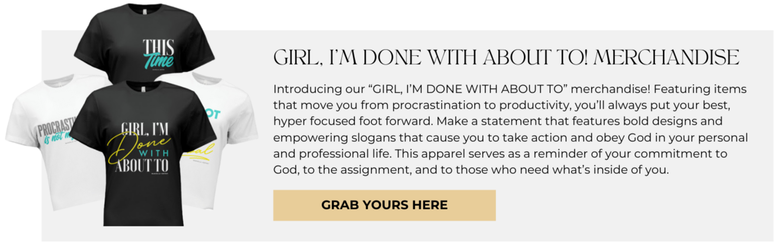 When you get rid of distractions and partner with ACTion, your motto becomes, "Girl, I'm Done With About To!"